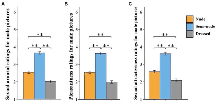 - For female participants, conducted one-way ANOVAs to compare ratings of sexual arousal, pleasantness, and sexual attractiveness across dressed, semi-nude, and nude male images.